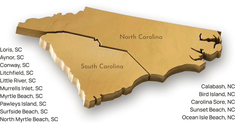 Serving: Aynor • Bird Island • Calabash • Carolina Shore • Conway • Litchfield • Little River • Loris • Murrells Inlet • Myrtle Beach • North Myrtle Beach • Ocean Isle Beach • Pawleys Island • Surfside • Sunset Beach
